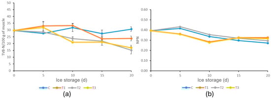 NPN is composed of free amino acids, peptides, amines, amine oxides, guanidine compounds, nucleosides, nucleotides, and urea, principally [28]. Figure 2b shows the behavior of NPN in tilapia fillets (Oreochromis niloticus) stored on ice for 20 days. An initial value of 0.39% was found; subsequently, NPN decreases from day 10 up to the end storage. As can be seen, a significant decrease (p < 0.05) in NPN was observed during storage, with the control treatment showing the lowest value. However, no significant differences were found between treatments on day 20. A decrease in NPN content has been reported for black skipjack muscle stored in ice for 24 d with 0.66 and 0.54% for the initial and final values, respectively [29]. In another study, Pacheco-Aguilar et al. [30] reported an initial value of 460 mg/100 g of muscle, decreasing at the end of storage on ice to 325 mg/100 g of Monterrey Sardine (Sardinops sagax) muscle. Therefore, its reduction may be associated with bacterial proliferation since it has been reported that the bacterial load can use certain low-molecular-weight nitrogenous compounds for its development [31].