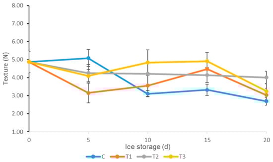 Texture is a very important sensory property of fish muscle. This can be influenced by several factors, such as species, size, fat content, among others, as well as by the conservation method [32]. Figure 3 shows texture changes during storage, finding that shear stress decreased significantly (p < 0.05) in all treatments, showing final values of 2.69 N (C), 3.03 N (T1), 4.01 N (T2), and 3.25 N (T3). This decrease is expected for all aquatic products stored in ice and can be associated with the endogenous proteolytic action on the structural proteins of the muscle, such as myofibrillar and connective tissue proteins [33,34]. In a study conducted by Lan et al. [19] with sea bass fillets, HIU was applied in combination with slightly acidic electrolyzed water (SAEW), and the authors found a drastic decrease in texture in the first two days of storage on ice. Subsequently, treatments that received HIU and the combination of HIU with SAEW (US + SAEW) showed a less pronounced texture reduction during the rest of storage compared to control fillets (without HIU). Similar results have been reported by Jayasooriya et al. [35], who applied ultrasound to bovine semitendinosus and longissimus muscles. These researchers found that the application of HIU reduced the decrease in texture during storage.