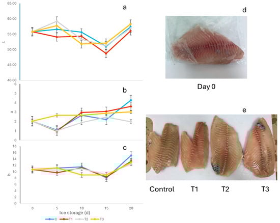 Appearance, particularly color, is one of the key factors involved in the acceptance of fish products. Figure 4 shows the color changes depending on the parameters L* (luminosity), a* (red—green), and b* (yellow—blue) on tilapia muscle (Oreochromis niloticus) stored on ice for 20 days. The behavior of the L* parameter (Figure 4a) showed a non-significant increase (p ≥ 0.05), with an initial value of 55.77 and final values of 57.36 (C), 56.01 (T1), 56.96 (T2), and 58.28 (T3). Comparable results have been reported by Coronado and Moreno [36], who stored tilapia muscle (Oreochromis niloticus) on ice, obtaining an initial and final value of 54 and 58.1, respectively. As can be seen, the behavior of this parameter was not affected by the application of HIU. Figure 4b shows parameter a*, with an initial value of 2.02 and final values of 4.27 (C), 3.60 (T1), 1.97 (T2), and 3.02 (T3). A significant increase (p < 0.05) was detected regardless the storage time. These results were lower than those reported by Coronado and Moreno [36], who found initial and final values of 10.6 and 8.10, respectively, for tilapia muscle (Oreochromis niloticus). These discrepancies may be due to the side selected to take the readings. The results of parameter b* are shown in Figure 4c. An initial value of 10.66 was obtained, while final values of 15.12 (C), 13.29 (T1), 12.45 (T2), and 12.92 (T3) (p < 0.05) were found. A slight increase at the end of storage indicates that the tilapia fillet tends towards a yellowish hue, a characteristic color of a fillet that is no longer fresh. However, this change was barely perceptible sensorially. Finally, Figure 4d,e show photographs of the fillets on days 0 and 20. On day 0 (Figure 4d), the fillet had a pinkish-red color, while on day 20 (Figure 4e), the control fillet showed a browner hue compared to the fillets subjected to ultrasound. These observations agree with what was detected through tristimulus colorimetry.