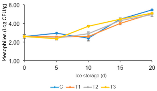 Microbial growth is one of the main causes responsible for the deterioration of aquatic products. Therefore, it is one of the main factors that determines the quality and shelf life of fish [37]. The international standard sets a maximum permitted value of 6 Log CFU/g of mesophilic microorganisms as satisfactory for fresh fish and from 6 to 7 Log as acceptable. Figure 5 shows the results of the total count of mesophiles in tilapia muscle stored in ice for 20 days. At the beginning of storage, a microbial load of 2.48 ± 0.11 log CFU/g was detected. This value is like that reported by Coronado and Moreno [36], who found an initial value of 3.2 log CFU/g in tilapia (Oreochromis niloticus), and is lower than that reported by Márquez-Ríos et al. [37] in loricariidae (4.2 log CFU/g).