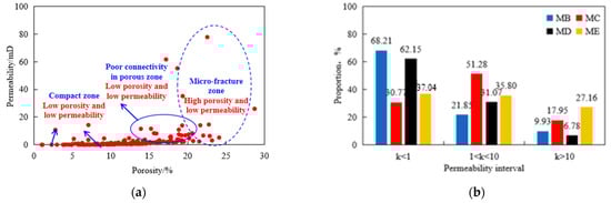 The relationship between porosity and permeability of the M reservoir shows that in the area where micro-fractures exist, the reservoir matrix is relatively dense, while the connectivity between the pore development areas is poor, resulting in low reservoir permeability, as shown in Figure 1a. According to the different permeability distribution ratios of the four layers in Figure 1b, the permeability distribution of the MD and ME layers is relatively homogeneous, and the porosity deviation ratio of the MB and MC layers is higher, but the overall permeability is generally poor.