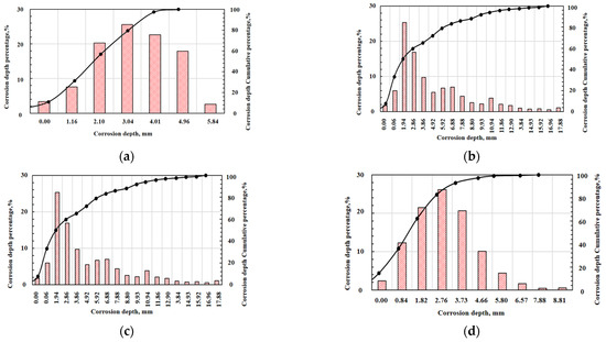 Statistics of 3D scanning corrosion depth distribution of the core end face after the acid-rock reaction in the four layers. (a) MB layer; (b) MC layer; (c) MD layer; (d) ME layer.