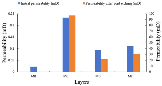 Permeability changes before and after acid etching in different layers.