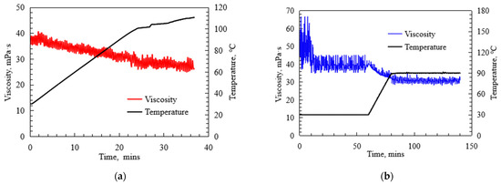 In order to further determine the shear resistance of the viscous acid in the reservoir environment, the temperature resistance and shear resistance of the viscous acid system at a shear rate of 170 S−1 were tested. The results are shown in Figure 7. The results in Figure 7a show that the viscosity of the acidizing fluid is stable at 35.45 mPa·s when the experimental temperature is increased from room temperature to 120 °C. The results in Figure 7b show that when the temperature is constant at 90 °C, the viscosity of the acid is stable at 39.35 mPa·s, which is greater than the lower limit of 18 mPa·s required by the construction. It shows that the acidizing fluid has good apparent viscosity, temperature resistance, and shear resistance, which meets the requirements of acidification construction.