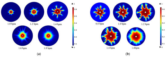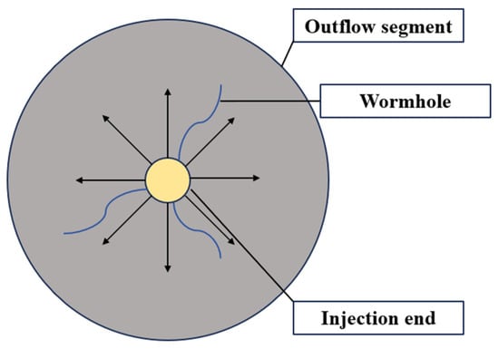 The expansion of wormholes in the near-wellbore area is shown in Figure 8. The simulation inlet adopts a constant flow boundary to establish a two-scale acid wormhole growth radial model. The two-scale continuous model consists of the Darcy-scale model and the pore-scale model. The Darcy-scale model describes the flow, transport, and reaction consumption of solute in porous media, as well as the change in porosity with the etching reaction. The pore-scale model calculates the parameters used in the Darcy-scale model through empirical formulas, such as the mass transfer coefficient, permeability, pore radius, and pore-specific surface area with the dissolution process. The two-scale model has good result accuracy and solution stability at different time steps [27,28,29]. It is the most commonly used mathematical model to study the formation of wormholes in reactive flow. The different etching forms calculated according to it are basically consistent with the experimental results. However, the two-scale continuous model also has some limitations. For example, when using radial grids, the injected acid can only flow along the radius direction or the circumferential direction, so the wormhole can only expand along these two directions, reducing the randomness of wormhole growth. However, in the simulation of this study, the accuracy can basically meet the requirements. The field construction experience shows that the contact surface area between the acid and rock is large, the acidification time is very short, and the acidification radius is basically maintained at about 1 m. The parameters of the model are taken from the experimental results and the reservoir field data. The mesh is locally refined near the wellbore to ensure the convergence of the calculation process. In the process of optimizing the acid pump rate, the acid corrosion near the wellbore will change with the change in the acid pump rate. With the increase in simulation time, when the acid etching effect does not change significantly with time after a certain time, it is considered that the acid dissolution form at this time is the final effect of acid wormhole expansion under the condition of the acid pump rate.