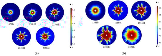 The simulation results of acidizing fluid volume optimization for the acidification of the MD and ME layers are shown in Figure 10, and the change in reservoir permeability is also used to characterize the effect of acid injection. The acid solution enters the formation at a constant pump rate for acid etching, which is a commonly used acid injection method in on-site construction. Under the condition of the selected optimal pump rate, the volume of acid used increases with the increase in injection time. When the amount of acid is less, acidification only acts on a small area near the wellbore, and the corrosion morphology is more homogeneous. With the increase in the volume of acid, the radius of acidification increases, the contact time between the acid and rock increases, and the etching depth of the rock increases gradually. Due to the heterogeneity of the reservoir, the acid etching radius is more obvious in a specific direction, and the acid etching wormhole is gradually formed. The volume of acid injection continues to increase, the acid wormhole continues to expand, and the inlet pressure gradually decreases. When the pressure difference between the inlet and outlet cannot meet the established flow rate, the wormhole will stop expanding. It is considered that there is a critical value for the volume of acid used to expand the acid wormhole. The simulation results show that for the MD layer, when the volume of acid reaches 255 bbl, the morphology of the acid wormhole will no longer change significantly, and the reasonable volume of acid should be 255 bbl. For the ME layer, when the acidizing fluid volume reaches 225 bbl, the acidification effect is the best.
