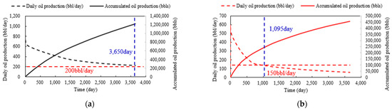 In order to compare the effect of acidification, the cumulative oil production of the X-24 well after acidification was simulated and predicted. Using the optimal acid pump rate and acidizing fluid volume obtained by the 5.2 simulation, the X-24 well was stimulated to increase production. There may be some problems in the process of dealing with real reservoirs. For example, the simulation ignores the influence of fractures that may exist in the reservoir. However, according to the data of this area, there are few fractures in the formation, so the influence can be ignored, and the simulation results still have guiding significance. After acidizing the MD and ME layers in the X-24 well, the predicted daily oil production is 1000 bbl/d and 600 bbl/d, respectively. As shown in Figure 11, assuming that the critical economic oil recovery rate is 200 bbl/d, the MD formation will produce 3650 days (1,217,680 bbl). The thickness of the ME reservoir is lower than that of the MD reservoir, and the formation of ME will last for 1095 days (251,100 bbl) at the critical economic oil recovery rate of 150 bbl/d. The simulation results show that viscous acid acidification can significantly increase the production of the X-24 well, which has a gradual decline in daily production, and obtain a better effect of increasing production.