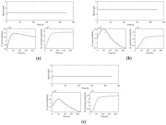 Biocontrol has been cited as an alternative for a long time in different areas [10] and continues to be relevant today [11], with the aim of reducing the use of SO2 in wines [12,13,14]. However, most studies focus on yeast selection and/or biocontrol mechanisms, and there is limited information on their application, especially in more real environments [15]. Biocontrol occurs due to the interaction of microorganisms; in this case, it is desired to take place in a pre-fermentation stage, as it is expected that Saccharomyces cerevisiae (through sequential inoculation), with its ethanol production, will conclude the biocontrol process against weakened spoilage yeasts [16]. A problem related to the applicability and realism of the must wine, as initially named, is the complexity of the involved yeast populations and their interactions. However, in order to advance the study of the interactions in the pre-fermentation must, it is relevant to abstract this to an individual interaction kinetic behavior (two populations). Specifically, an interaction previously studied by us involves Wickerhamomyces anomalus and Z. rouxii. The former was selected for its positive oenological attributes but primarily for its wide spectrum of action against the strains of Z. rouxii and Brettanomyces bruxellensis (two of the major contaminants of musts and wines). This interaction, based on our investigations, is a case of amensalism (killer) [17]. This type of interaction involves two simultaneous characteristics, competition for the medium and the emission of the toxin (amensalism) [15]. Therefore, unlike adding SO2, the kinetics of the interaction is highly relevant, as the inhibitory molecule must be produced in the medium during the development of both populations [16].