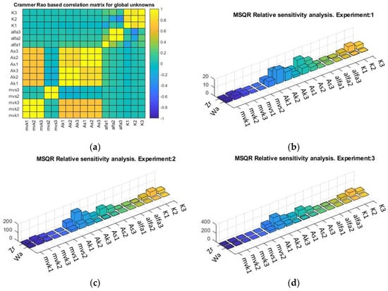 (a) Crammer/Rao matrix correlation from global analysis. Relative parametric sensitivity by experiment: (b) pH: 3.2, (c) pH: 3.7, and (d) pH: 4.2. Zr: Zygosaccharomyces rouxii, Wa: Wickerhamomyces anomalus.