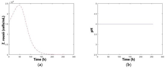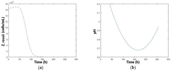 The variable profile (Figure 6b) starts at a high pH (4.2) and is maintained for a period of 48 h, which would be relevant in musts from the region with high pH (pH > 3.8) [21,62]. Biologically, this may be related to the prediction of the model to improve the fitness of the biocontroller yeasts initially, which would consequently prevail in the medium [45], also in terms of toxin production as a primary metabolite. Then, the pH begins to decrease gradually, probably to a pH where the multiplication of the biocontroller population is lower but the efficiency of the toxin increases in terms of the toxicity or sensitivity of the spoilage yeasts, thus controlling the spoilage population more effectively [20,56]. Subsequently, the pH profile should increase again, possibly to maintain the competitive advantage of the biocontroller. This could be related to the low concentration of sensitive cells present in the medium and the difficulty of controlling those, caused by spatial distancing [16].
