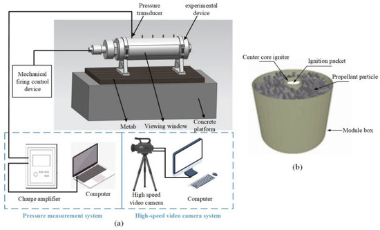 In this work, a visual simulation experiment system is designed and built, as shown in Figure 1a. It consists of a simulation experiment device, a pressure measurement system, and a high-speed video camera system. The energetic module used in the experiment is shown in Figure 1b. It is composed of the module box, energetic particles, the igniter, and the ignition packet. On this basis, the simulation experiment can be carried out on the early launching process of the modular charge. In this process, the high-temperature and high-pressure gas jet produced by the combustion of the ignition powder is sprayed into the module box through the hole of the igniter side wall. The signal is amplified by a charge amplifier and input to the computer, which is stored as the pressure data. The experimental device is equipped with a transparent viewing window. The high-speed video camera system consists of the FASTCAM Mini AX-50 and a computer. The computer is used to control the switch of high-speed video instruments and the storage of video data.
