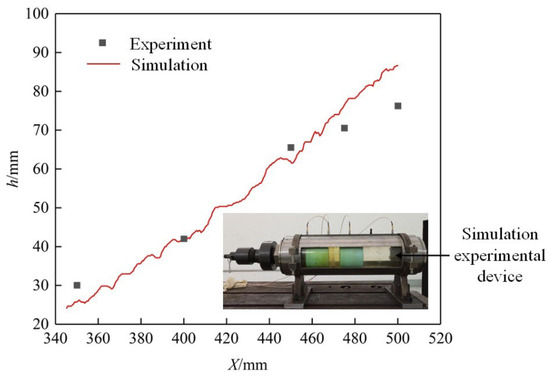 The experimental study on the early launch process of the two-module charge is carried out. Thereinto, the distance between modules is 50 mm, and the distance between the module and the left surface of the chamber is 60 mm. The “cold simulation method” is adopted to observe the motion of particles, module rupture, and particle accumulation, in which the simulated particles made of incombustible inert materials are used to replace the propellant particles. During the experiment, the simulated particles move violently by the high-pressure, high-temperature gas after the module is destroyed. At last, the particle final accumulation is measured. The center of the left surface of the chamber is set as the zero point, and the axis of it is set as the X-axis. Finally, most of the particles accumulated in the area of 310~500 mm in the axial direction with a steep slope distribution. In addition, the calculated particle stack height is compared with the experimental one, as presented in Figure 2. The average error is about 8.5%, indicating that the model is reasonable.