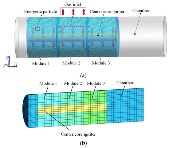 The condition with three energetic modules is taken as an example to show the geometric structure of the calculation model for energetic particle groups with the sequence-change space, as illustrated in Figure 3a. The 3D rectangular coordinate system presented in Figure 3 is established to carry out the numerical analysis of particle motion and dispersion. In the numerical calculation, both initial velocities of gas and solid are 0, the initial gas pressure in the chamber is the atmospheric pressure, and the initial temperature is 300 K. Both walls of the module and the chamber are fixed boundaries. The wall adopts nonslip boundary conditions. The computational domain is divided by the structural grid. Due to the large pressure gradient in the area near the igniter, the grids in the area near the central core igniter are refined during grid division, as shown in Figure 3b.