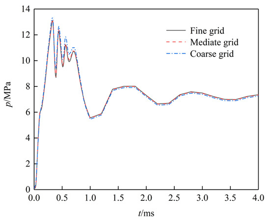 In the CFD-DEM method, the mesh size should be larger than the particle size. Three groups of structured grids with main dimensions of 9 mm (fine grid), 12 mm (mediate grid), and 13.5 mm (coarse grid) are used to divide the computational domain. Then, point A (X = 90 mm, Y = 0, Z = 66 mm) in the module is selected as the monitoring point. The comparison of pressure change curves at point A calculated by the three groups of grids is illustrated in Figure 4. The average error between mediate grid data and fine grid data is 1%, and the average error between coarse grid data and fine grid data is 4.5%. There is no systematic difference between the three grid calculation results. Considering the efficiency and accuracy of calculation, the mediate grid is used for numerical calculation.