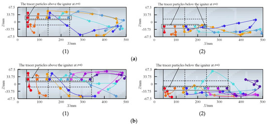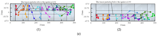 The motion path of the tracer particles in the three working conditions: (1) the tracer particles above the igniter; (2) the tracer particles below the igniter; (a) the motion path of the tracer particles in the two-module charge; (b) the motion path of the tracer particles in the three-module charge; (c) the motion path of the tracer particles in the four-module charge.