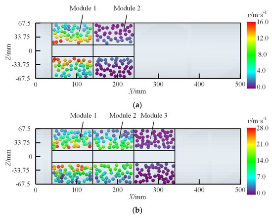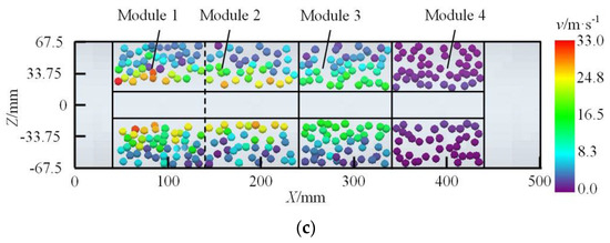 In this stage, the motions of particles in the three working conditions are shown in Figure 6. From the figure, the particles in module 1 are accelerated first under the action of the radially input gas, and the speed of the particle near the igniter is the highest. Then, particles in module 2, module 3, and module 4 begin to accelerate successively. This is because the gas sources inside modules are generated from left to right. During this process, the inner diameters of particle groups in modules are increased, as illustrated in Figure 6c. After particles move radially for a while, some particles collide with the wall of the module, the particle velocity is decreased, and the direction of motion changes to antiradial. This part of particles with the opposite motion direction collided with those with the original direction. After the collision, the velocities of both particles are decreased, and the motion directions of those change.