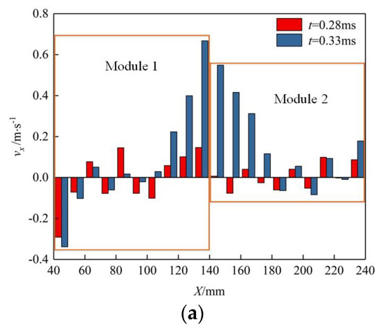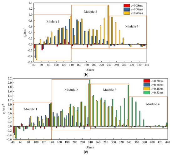 The in-module stage ends when the cover of the rightmost module is opened. In this process, modules are destroyed in turn. The space of the modules is divided into the unit slices equally along the axis with a length of 10 mm to analyze the variation of the average value of the particle axial velocity with the axial position. The changes of the average axial velocity in the three working conditions are shown in Figure 7. For the 2 M charge, the end faces between module 1 and module 2 are broken at t = 0.28 ms. At this moment, the axial velocity of particles in module 1 is larger than that of particles in module 2, and the maximum value is in the area (40 mm < X < 50 mm). The axial motion direction of particles is irregular. The cover of module 2 is opened at t = 0.33 ms. The closer the particle is to the end faces between module 1 and module 2, the greater the axial velocity. The maximum value exists in the area (130 mm < X < 140 mm), as presented in Figure 7a. For the 3 M charge, the end surfaces between module 1 and module 2 are destroyed at t = 0.28 ms. At t = 0.38 ms, the end faces between module 2 and module 3 are broken. Thereafter, the spaces of module 1, 2, and 3 are axially connected, and the axial velocities of particles change by the gas. From Figure 7b, the particle near the cover in module 1 and particles in module 2 and 3 move to the right. When the cover of module 3 is destroyed, the particle axial velocity in module 3 is decreased along the axial direction, while that in module 1 is increased. The axial velocity of particles in the middle of module 2 is smaller than that near both end faces, as illustrated in Figure 7b. For the 4 M charge, the change law of the axial velocity is similar to the above two working conditions. After the end faces between modules are destroyed, the particles near the end faces obtain the positive axial velocity. When the cover of module 4 is opened, the maximum value of axial velocity exists in the area (230 mm < X < 240 mm) near the cover of module 2. In the three working conditions, the axial velocity of particles in the connected module increases from both sides to the middle. When the rightmost module is opened, the particle axial velocity increases with the increase in the number of modules.
