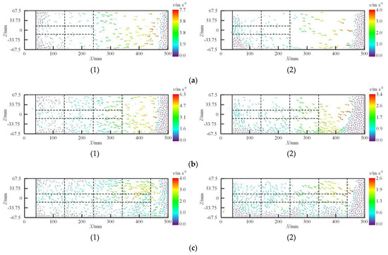 Front view of the particle velocity vector in the out-module stage: (a) the vector of the particle velocity in the two-module charge at t = 8 ms; (b) the vector of the particle velocity in the three-module charge at t = 5.85 ms; (c) the vector of the particle velocity in the four-module charge at t = 4.2 ms.