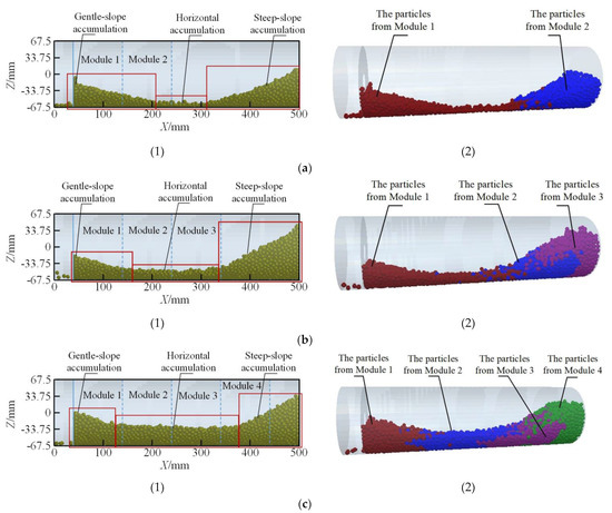 When particles have been stationary, the particle distributions in the three working conditions are shown in Figure 10. The step point of the particle stacking height is taken as the dividing point of the distribution form. All three particle distributions consist of the gentle-slope shape, the horizontal shape, and the steep-slope shape accumulations. From Figure 10(a2), the particles in the gentle slope and the horizontal shape are from module 1, and the particles in the steep slope are from module 2. From Figure 10(b2), the particles in the gentle slope are from module 1, most of the particles in the horizontal accumulation are from module 1, and a few are from module 2. The particles from module 2 are located below those from module 3 for the steep slope. From Figure 10(c2), the particles in the gentle slope are from module 1. The horizontal accumulation consists of a mixture of particles from modules 1, 2, and 3, and the particles from module 3 are located below those from module 2. And the particles from module 3 are located below those from module 3 in the steep slope. With the increase in the module number, the axial distribution of particles from module 1 is shortened.