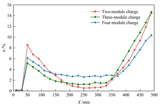 The space is divided into 25 units with a height of 20 mm, and the percentage of particle number in the unit to the total particle number is calculated as n to study the uniformity of particle axial distribution. The changes of n along the axis when two to four modules are loaded, respectively, are shown in Figure 11. For the 2 M charge, the minimum proportion in the chamber nmin is 0.537%, the maximum proportion in the gentle slope ng is 8.541%, and the maximum proportion in the chamber nmax is 14.495%. For the 3 M charge, nmin = 1.226%, ng = 5.129%, and nmax = 14.645%. For the 4 M charge, nmin = 2.604%, ng = 6.123%, and nmax = 10.342%. As can be seen from the figure, the particle proportion is increased along the axial from the middle to both ends and that near the left end of the chamber is increased slowly, while that near the right end of the chamber is increased rapidly. With the increase in the module number, the change curve of particle proportion along the axis gradually becomes gentle. When four modules are loaded, the distribution of particle proportion along the axis is the most uniform.