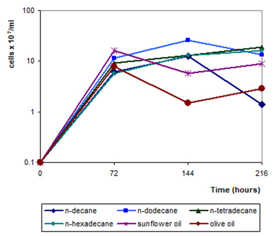 The ability of the strain C. parapsilosis CMGB-YT to assimilate n-alkanes and vegetable oils as sole carbon substrates was assessed by monitoring the cell growth over 216 h (9 days). Within the first 72 h, the strain recorded a significant cell growth on all the media (Figure 1), after which differences appeared between the curve profiles obtained on n-alkanes and vegetable oils, respectively. Thus, the growth was maintained with a good rate until 144 h for all the n-alkanes, and continued in the presence of n-tetradecane and n-hexadecane until the end of the experiment. On the contrary, after 144 h, a rather important drop was recorded in the media supplemented with n-decane and, to a smaller extent, with n-dodecane. When vegetable oils were used, the growth followed a descending slope between 72 and 144 h. After this point, the growth was restored, maintaining a higher rate in the presence of sunflower oil compared to olive oil.
