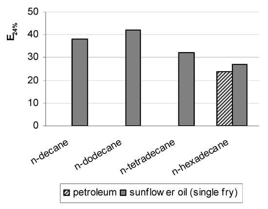 Biosurfactant production was evaluated using the emulsification index (E24%). For this purpose, the cell-free broth (crude biosurfactant) from a culture of C. parapsilosis CMGB-YT grown on YP medium with 10 g/L of each n-alkane for 144 h at 28 °C and 150 rpm, was mixed (3:2 v:v) with petroleum (FLUKA) and commercial refined sunflower oil (“Untdelemn de la Bunica”)—single fry, respectively, then the mixture was vortexed at 2500 rpm for 2 min, and maintained at 22 °C for 24 h. The emulsification index was determined according to Cooper and Goldenberg [26].