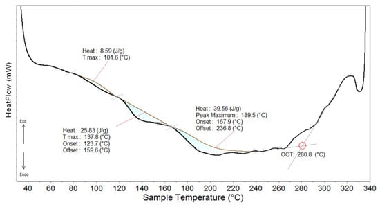 Differential scanning calorimetry (DSC) is a powerful analytical technique used to study the thermal properties of biosurfactants by measuring the heat flow into or out of a sample during heating or cooling. This method provides valuable information about phase transitions, melting points, and thermal stability [49]. The DSC thermogram (Figure 5) recorded on the biosurfactant exhibited three endothermic peaks: the first (80–120 °C) could be associated with the evaporation of water moieties, while the other two peaks (with peaks at 138 °C and 189 °C) most likely represent the melting of different components within the biosurfactant molecule [50]. The exothermic peak starting around 270–280 °C indicates the onset oxidation temperature (OOT), which is an important parameter that reflects the biosurfactant’s thermal stability [49,51]. At temperatures lower than the OOT, the biosurfactant is considered stable and less prone to degradation through oxidation. These results are consistent with those obtained for similar biosurfactants [50].