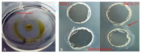 Agar double diffusion confirmed the anionic character of the C. parapsilosis YT-CMGB biosurfactant. A precipitation line (Figure 6B) formed only between the biosurfactant and the cationic barium chloride, but not with the anionic SDS.