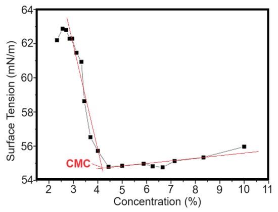 Figure 7 depicts the CMC behavior of the C. parapsilosis biosurfactant. Initially, as the concentration of the biosurfactant increased, the surface tension decreased significantly, indicating that the biosurfactant molecules were adsorbing at the air–water interface, reducing the surface tension. At a concentration of about 4.2% of biosurfactant, the curve was stabilizing, indicating that the CMC has been reached. Beyond this concentration, the surface tension remained relatively constant despite increasing the surfactant concentration, signifying that any additional surfactant molecules contribute to micelle formation rather than further reducing surface tension, with this behavior being characteristic of surfactants [52,53].