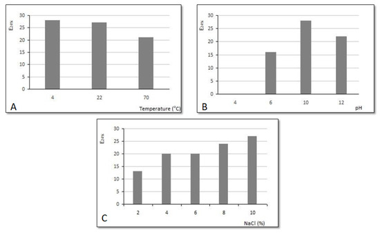 The stability of the emulsifying activity of the crude biosurfactant was determined at different temperatures (4 °C, 22 °C, and 70 °C, respectively), pH values (4.0; 6.0; 10.0; 12.0) and sodium chloride (NaCl) final concentrations (2%, 4%, 6%, 8% and 10%), by calculating E24% towards sunflower oil (single fry) similar to the method from 2.3. [28,29].