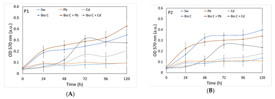 The growth curves of the yeast strains R. mucilaginosa CMGB-G1 and R. mucilaginosa CMGB 188 were determined in synthetic wastewater contaminated and uncontaminated with Pb2+ and Cd2+ ions, both in the absence or presence of crude biosurfactant. For this purpose, the 96-microwell plates were used with a final volume of 400 µL/sample inoculated with 1% suspension of R. mucilaginosa CMGB-G1, respectively, R. mucilaginosa CMGB 188 with an initial concentration of 2 McFarland (for Sw, Pb and Cd with P1, and P2, respectively), adding 5% (v/v) crude biosurfactant (for Bio C, Bio C + Pb, Bio C + Cd) (Table 1). The growth of the yeast cultures was determined during the 120th hour of the experiment by readings of the optical density (OD) at 570 nm using a Synergy HTX Multimode reader (BioTEK, Winooski, VT, USA).
