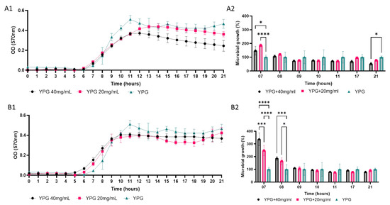 The antimicrobial effect of the biosurfactant produced by C. parapsilosis YT-CMGB: (1) the impact on the yeasts’ growth behavior; (2) the growth inhibition percentage determined at specific points of time; (A1,A2)-C. krusei CMGB94; (B1,B2)-C. krusei CMGB-Y8 (Tukey multiple comparison test; where * p < 0.05, *** p < 0.001, and **** p < 0.0001).