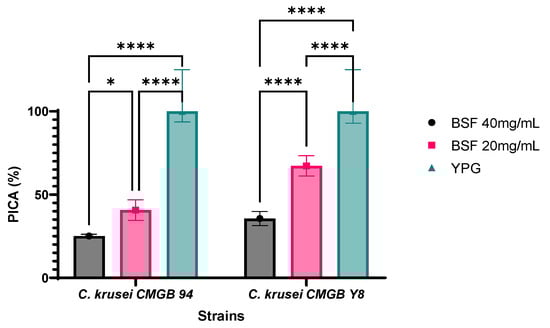 Graphical representation of the inhibitory effect on the adhesion capacity of C. krusei CMGB94 and C. krusei CMGB-Y8 strains treated with different concentrations of biosurfactant produced by C. parapsilosis YT-CMGB (Dunnet’s multiple comparison test; where * p < 0.05, and **** p < 0.0001).