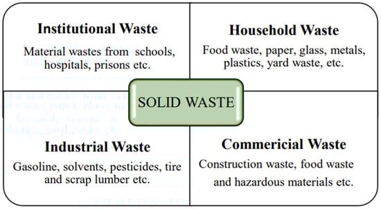 Modernization and population growth worldwide have led to the overproduction of SW. Currently, only 51% and 16% of SW are recycled in developed and developing countries, respectively [1]. As shown in Figure 1, SW is generated by households, businesses, industries, and institutions. Household waste accounts for more than half of total SW production and includes food waste, paper, glass, metal, plastic, diapers and dirty paper towels, yard waste, and specialty waste such as electronic materials. Commercial waste, which includes commercial formations and private or public marketplaces, is the second largest source of SW after households. Moreover, institutional waste from medical centers, educational schools, prisons, and other government institutions comes as third, while other SW generated by manufacturing sectors or industries comes forth. Improper management of SW, particularly the large quantities left untreated and disposed of in open landfills, leads to significant GHG emissions and other ecological challenges. The primary GHGs emitted from landfills are CH4 and CO2, and these harmful gases are released into the atmosphere, contributing to global warming and climate change. Therefore, the impact of GHG emissions on the environment has attracted increasing attention, and it is imperative to reduce their emissions to mitigate the consequences of climate change. Figure 1 illustrates the different sources of SW.