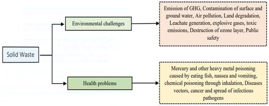 Due to the lack of SW treatment facilities in developing countries, about 93% of waste is disposed of in open dumps, while only 2% of waste in developed countries is disposed of in open dumps [1]. This shows that improper handling of SW can lead to large amounts of GHG emissions, which in turn can cause global warming and other related ecological problems. CH4 and CO2 are the main gases produced by SW and are reported to be the most significant contributors to climate change [18]. These gases are produced by the anaerobic decomposition of SW in dump sites. CH4 is a potent GHG, with a warming capacity more than 80 times greater than that of CO2 within a short time after entering the atmosphere; however, while CO2 has a more lasting effect, CH4 determines the rate of warming in the short term. Nowadays, about 30% of global warming is caused by CH4 [19]. In addition, SW can also contaminate surface water and groundwater, due to leachate generated by open dumping. Some treatment methods, such as incineration, release toxic gases, including sulfur dioxide, nitrogen oxides, and particulate matter, that pollute the environment. These contaminants may cause cancer, cardiovascular disease, and respiratory problems. However, modern incineration facilities are equipped with advanced air pollution control systems to mitigate these emissions. Figure 2 shows the ecological and health challenges caused by SW.