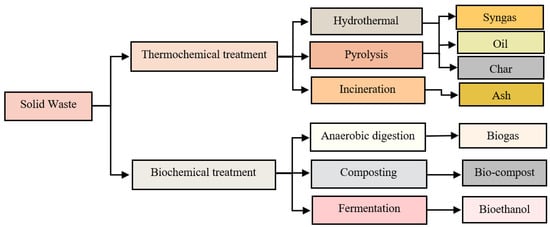 Composting is the biodegradation of SW and makes a significant contribution to recycling organic waste streams [40], while fermentation treatment is a biological process that converts carbohydrates from SW into bioethanol [41]. Additionally, this process is eco-friendly, with less pollutant emissions. Figure 3 shows the thermochemical and biochemical treatment of SW.