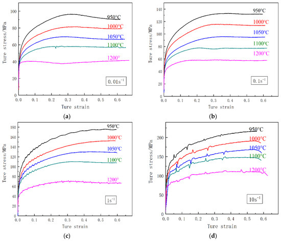 According to Figure 3, the true stress increases with the increase in the deformation rate provided that the deformation temperature is unchanged; and with the increase in the experimental temperature, the difference between each peak and the corresponding steady flow stress is narrowed. For instance, when the temperature is 950 °C, the peak stress increases gradually as the strain rate increases from 0.01 to 0.1, 1, and 10 s−1. It can be concluded that as the peak flow stress is almost equal to the steady stress given high deformation temperatures and strain rates (for example, when the strain rate reaches 1 or 10 s−1 and the temperature rises to 1100 or 1200 °C), i.e., the peak stress is not clear, this indicates that the material has undergone dynamic recovery but no dynamic recrystallization.