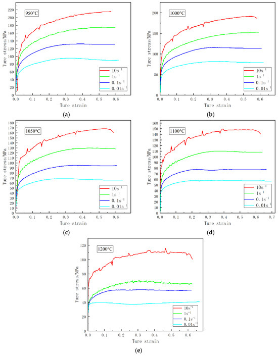 True stress–true strain curves for 25CrMo4 at different strain rates and temperatures: (a) 950, (b) 1000, (c) 1050, (d) 1100, and (e) 1200 °C.