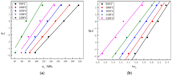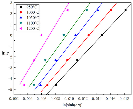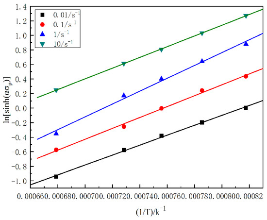Under the condition of high-temperature ductility, the relation among the flow stress, strain rate, and temperature of conventional thermal deformation can be indicated by the Sellars–Tegart equation [15] (Equation (1)), which involves deformation activation energy Q and temperature T.