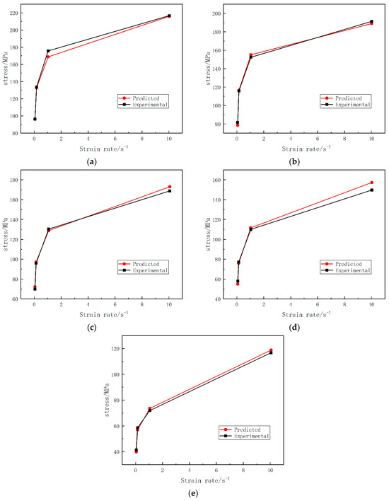 In order to verify the accuracy of the constitutive equation, the authors employed strain assignment to obtain different values of Q, A, β, n, and α. Equation (13) was substituted with the obtained data to deduce different strain rate expressions and stress values predicted under different deformation conditions. As shown in Figure 7, the relative errors between the predicted and experimental values of stress are −0.23% at the minimum and 5.2% at the maximum, which indicates that the constitutive model of strain–strain rate compensation can favourably predict the stress of 25CrMo4 steel at high temperature.