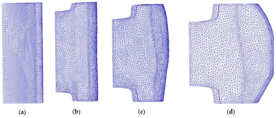 Mesh diagram of inner core wheel forming process: steps (a) −1, (b) 90, (c) 190, and (d) 254.