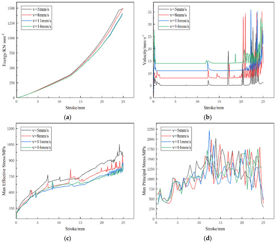 Simulation results for different upper-mould motion speeds: (a) energy–stroke curves, (b) maximum metal flow velocity–stroke curves, (c) maximum effective stress–stroke curves, and (d) maximum principal stress–stroke curves.