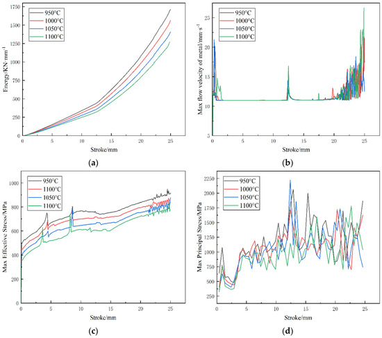 Simulation results for different billet starting forging temperatures: (a) energy–stroke curves, (b) maximum metal flow velocity–stroke curves, (c) maximum effective stress–stroke curves, and (d) maximum principal stress–stroke curves.