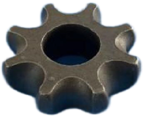 From the numerical results, a set of optimal parameters was deduced, and an experimental setup was designed. A 100 t hydraulic press was used for forging. The choice of blank material was 25CrMo4. To improve the comprehensive performance of the forging, the blank was phosphated and then put into the mould cavity for forging. The heating temperature of the blank was 1050 °C, the heating temperature of the mould was 200 °C, and the pressing speed was 11 mm·s−1. Then, one-liquid lubrication equipment was used to control the mould and blank friction at 0.3. The products prepared by the forging, heat treatment, and corrosion washing processes are shown in Figure 15. The forging was filled well; the surface was smooth; there were no cracks, folding, or other defects; and the dimensional accuracy fully met the requirements. The application of this process can improve production problems such as inefficiency, high cost, and inconsistent quality in the manufacture of inner core wheels.