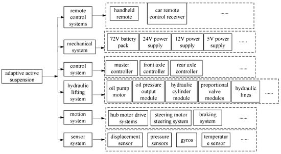 This adaptive active suspension system is mainly composed of six parts: a remote control part, a power part, a control part, a hydraulic lift part, a motion part, and a sensing part. The structural composition of these six parts is shown in Figure 1.