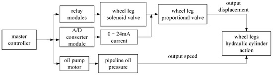 The four hydraulic cylinders for each wheel leg operate independently, allowing control strategies for one cylinder to apply seamlessly to the others. Upon receiving a signal from the remote controller, the controller initiates the control process for the wheel-leg hydraulic cylinder. Initially, the oil pump motor is activated to supply hydraulic pressure to the system, followed by the opening of the solenoid valve to regulate the hydraulic cylinder. The controller adjusts the output current size via the A/D converter module, directly influencing the proportional valve and controlling the hydraulic cylinder’s displacement. The magnitude of the oil pressure from one of the oil pump motors mainly impacts the speed of the hydraulic cylinder’s movement. Conversely, the control volume of the proportional valve primarily determines the displacement of the hydraulic cylinder. For example, if the control volume of the proportional valve is set between 0–20 mA, the hydraulic cylinder extends from 0 to its maximum value.