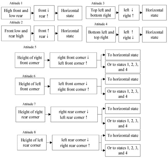 When the body is in a raised state at the rear left corner, the hydraulic cylinder of the rear left corner wheel leg is adjusted downward. As the rear left corner wheel-leg hydraulic cylinder descends, the body may transition into a horizontal state, or it may assume one of attitudes 1–4. If the latter, adjustments are made to transition the body to the desired state. Several unbalanced attitudes adjustment processes are shown in Figure 4.