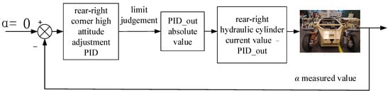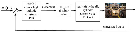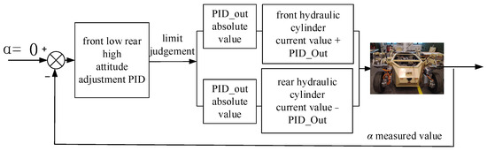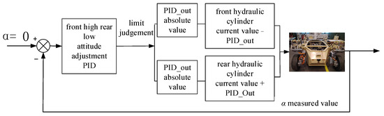 When the body assumes a state of front low/rear high, the angle of β is approximately 0, while the angle of α is less than 0. A PID closed-loop adjustment is devised for this condition. The input for this state is set as α = 0, directing the output of the PID controller to elevate the front two hydraulic cylinder wheel legs and depress the rear two hydraulic cylinder wheel legs. This adjustment aims to align the body horizontally. The PID closed-loop adjustment for the front low/rear high attitude is illustrated in Figure 7.