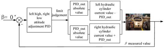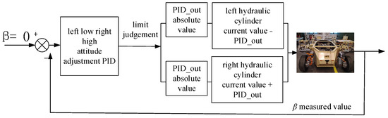 When the body is in a high left/low right state, the angle of α is approximately 0 and the angle of β is more than 0. According to this state, a PID closed-loop adjustment is designed. The input of this state is β = 0, and the output of the PID controller acts on the left and right hydraulic cylinders to make the wheel legs of the left two hydraulic cylinders move downward and the wheel legs of the right two hydraulic cylinders move upward, adjusting the body attitude to put the body in a horizontal state. The PID closed-loop adjustment of the left high/right low attitude is shown in Figure 8.