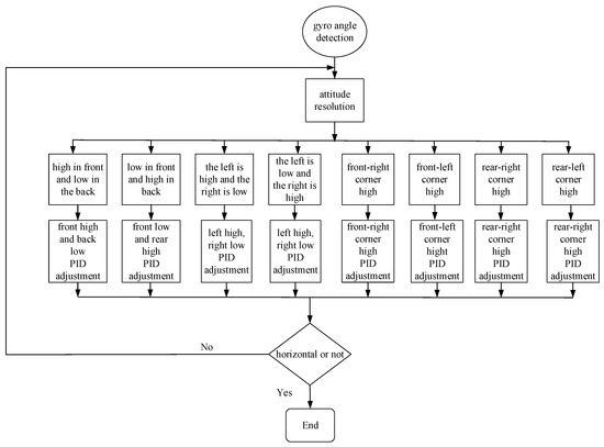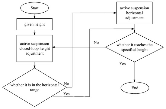 After the closed-loop height adjustment, the gyroscope checks whether the body falls within a designated horizontal range. If it does not, leveling is still necessary. The flowchart detailing the algorithm for height adjustment in the adaptive active suspension is presented in Figure 16.